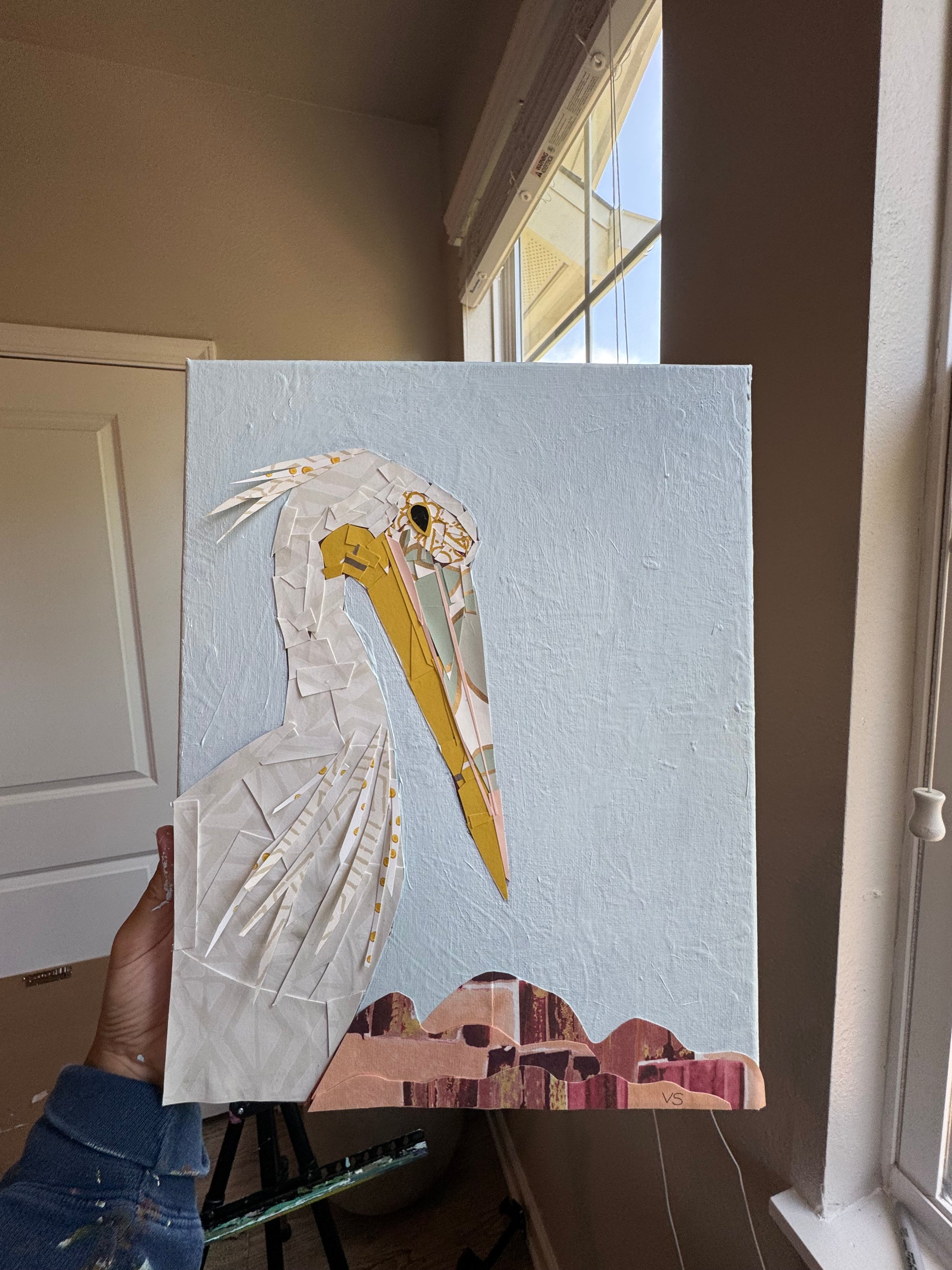 Mixed media collage with recycled papers and acrylic paint on 11” x 14” canvas